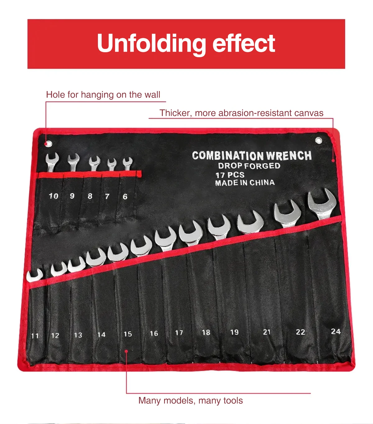 PORTABLE STORAGE BAG: Equipped with a high-quality canvas storage bag, the tools can be divided into separate pockets and can also be rolled up for storage. In addition, the pouch has two holes for hanging on the wall for easy access.