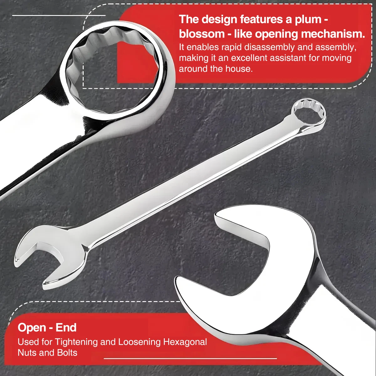 Multi-function spanner: suitable for car, motorbike and bicycle repair, as well as carpentry, household machinery, construction and other fields. Whether you are repairing cars, electrical appliances, furniture, or machinery, it will come in handy. With it, life will be more convenient and easy.