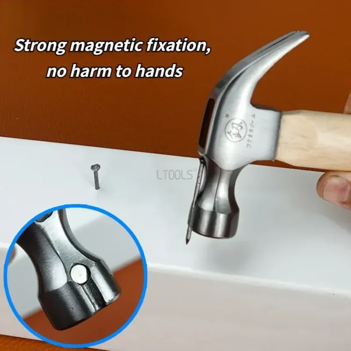 Feature: Mini claw hammer, solid wood handle, high carbon steel hammer head, polished surface, magnetic design, easy to absorb screws, convenient for work.