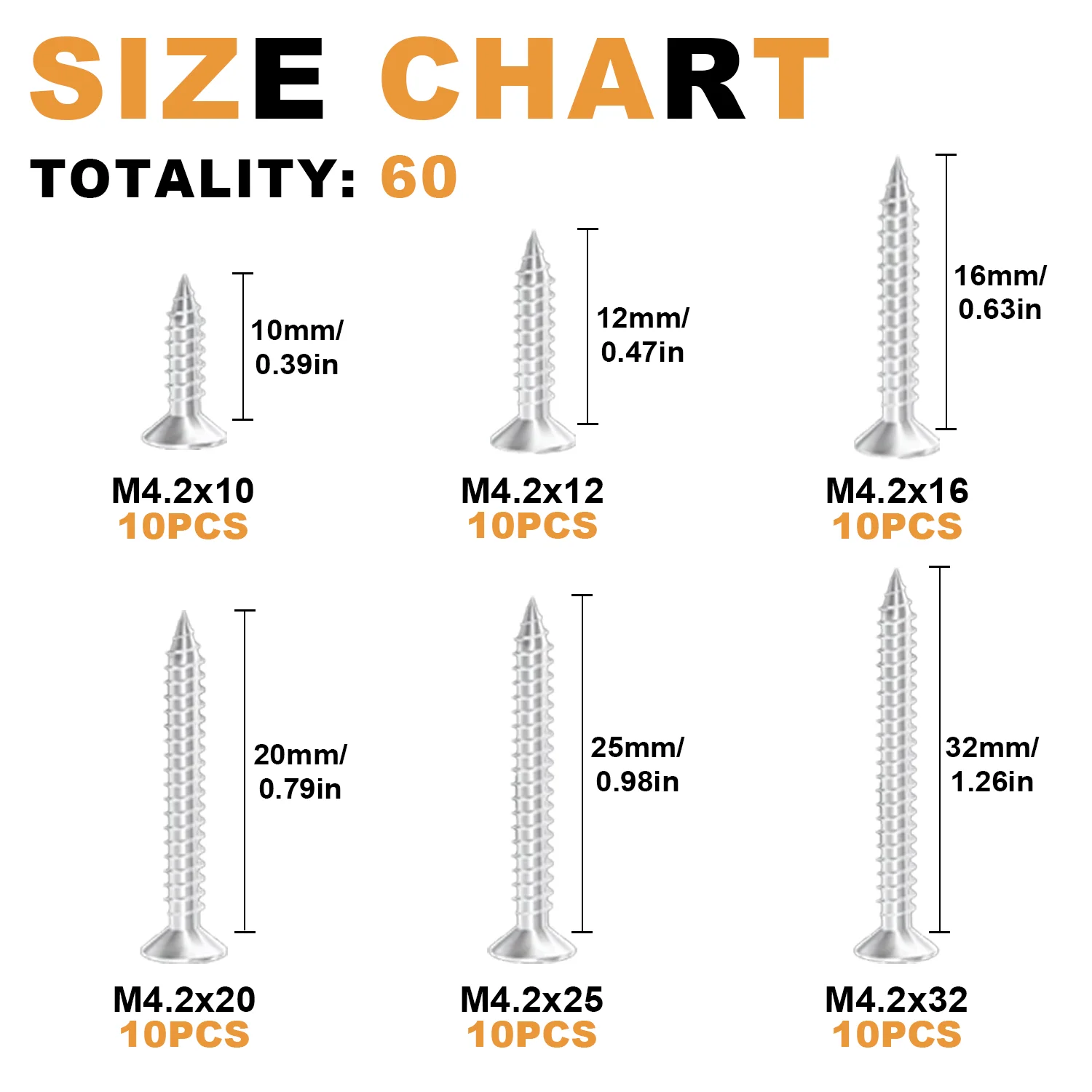 #8 Self-Drilling Wood Screw Set, 60pcs Cross Flat Head Steel Plate Screws with Self-Locking Nuts, Wood Thread Screw Kit