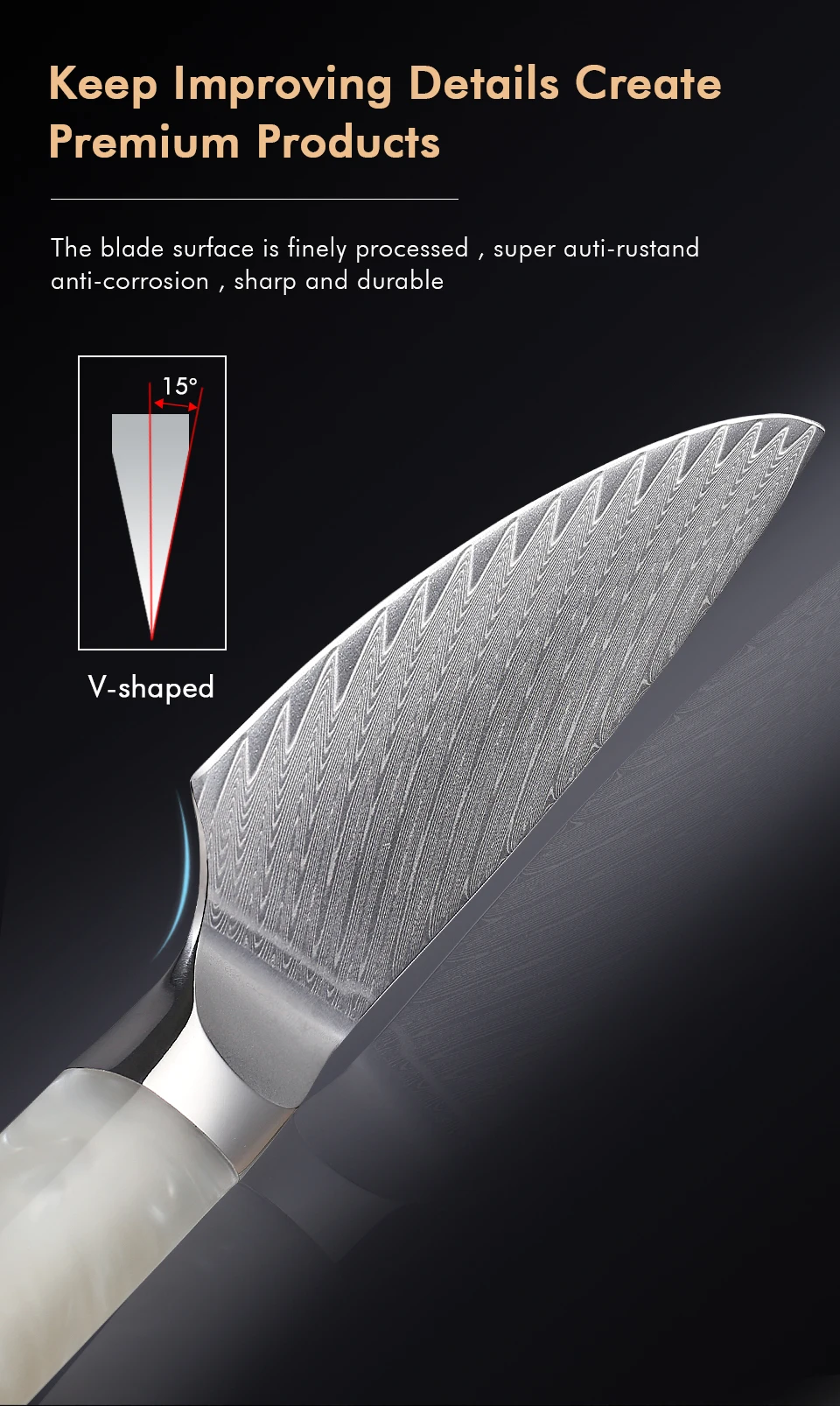 Exterior features: sharp and durable, super rustproof, optical sharpness