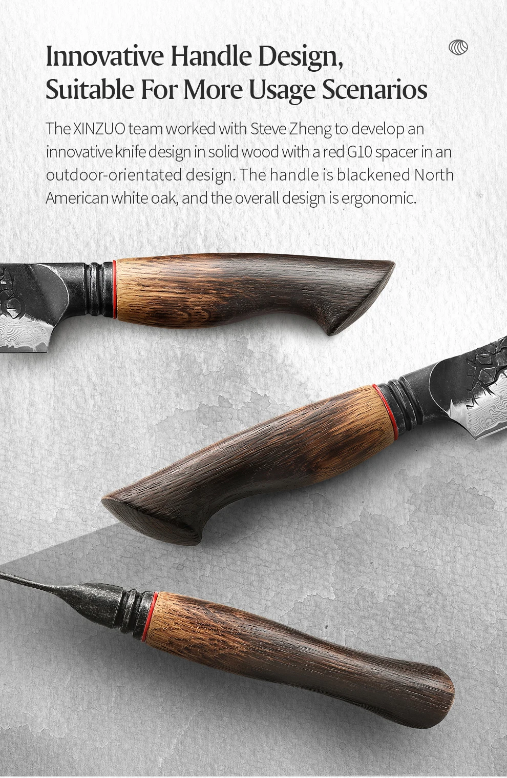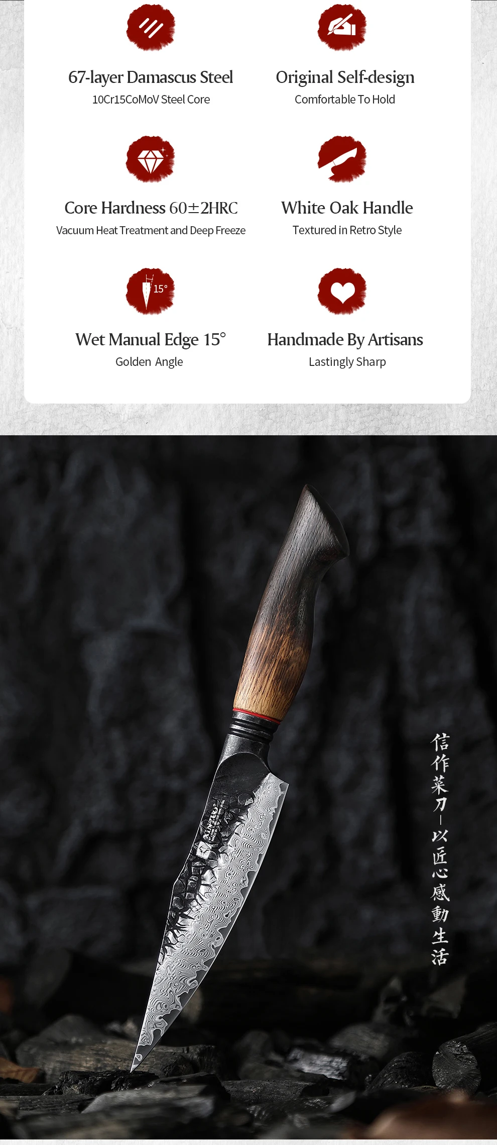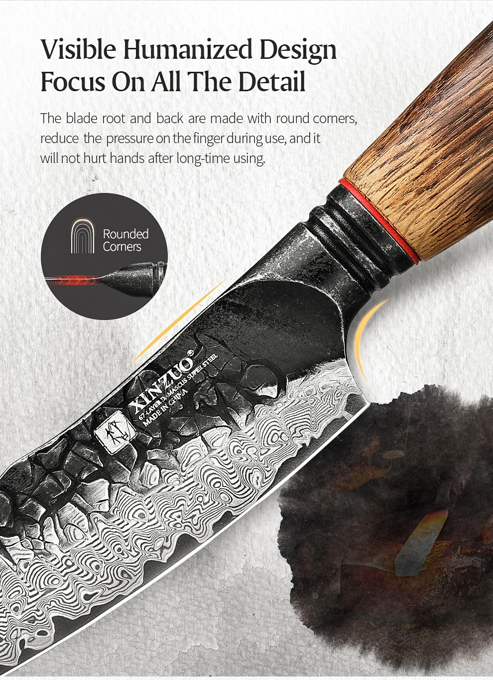 XINZUO 5.5″ utility knife, 67 – Layer Damascus Masterpiece, forged with super steel, offers unrivaled sharpness and durability.