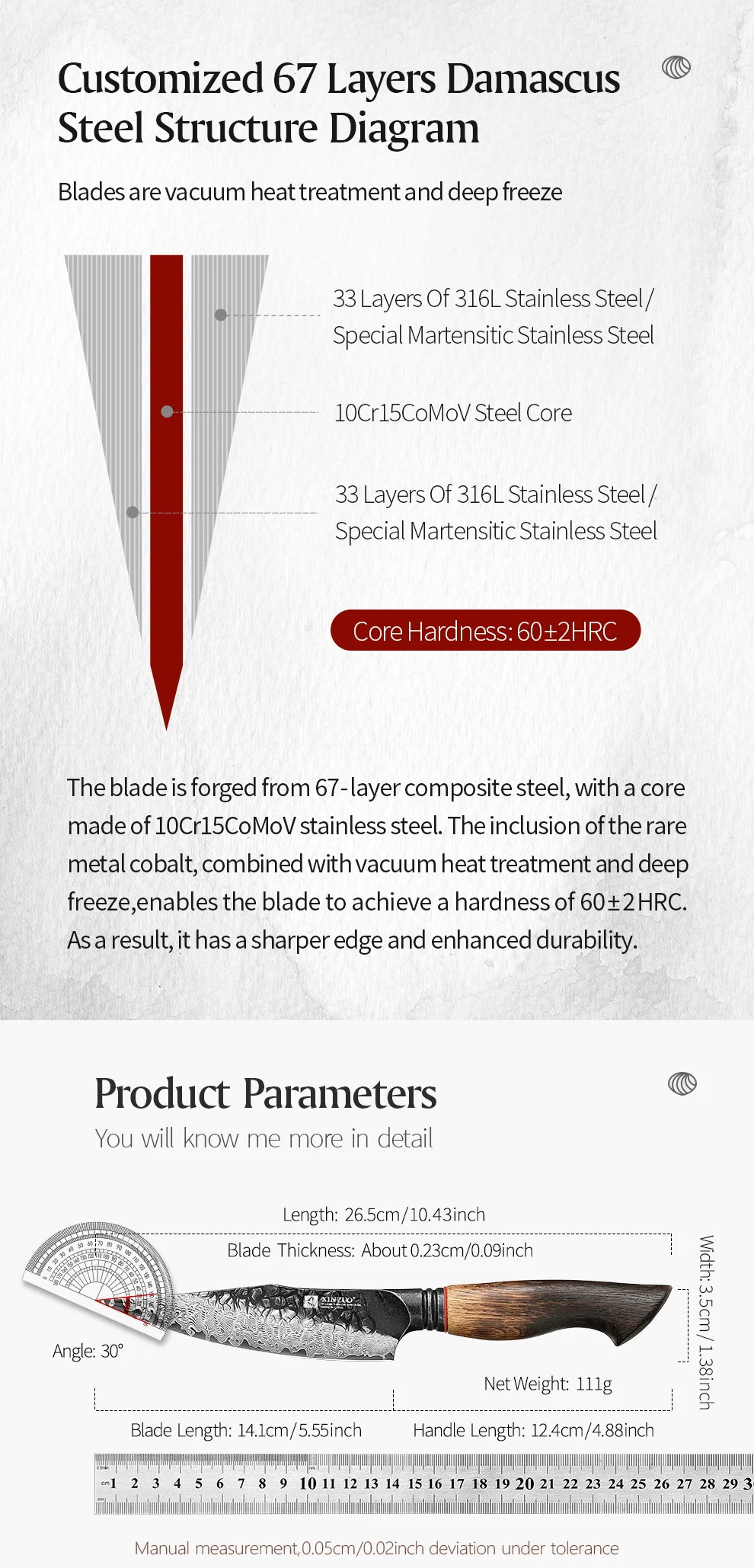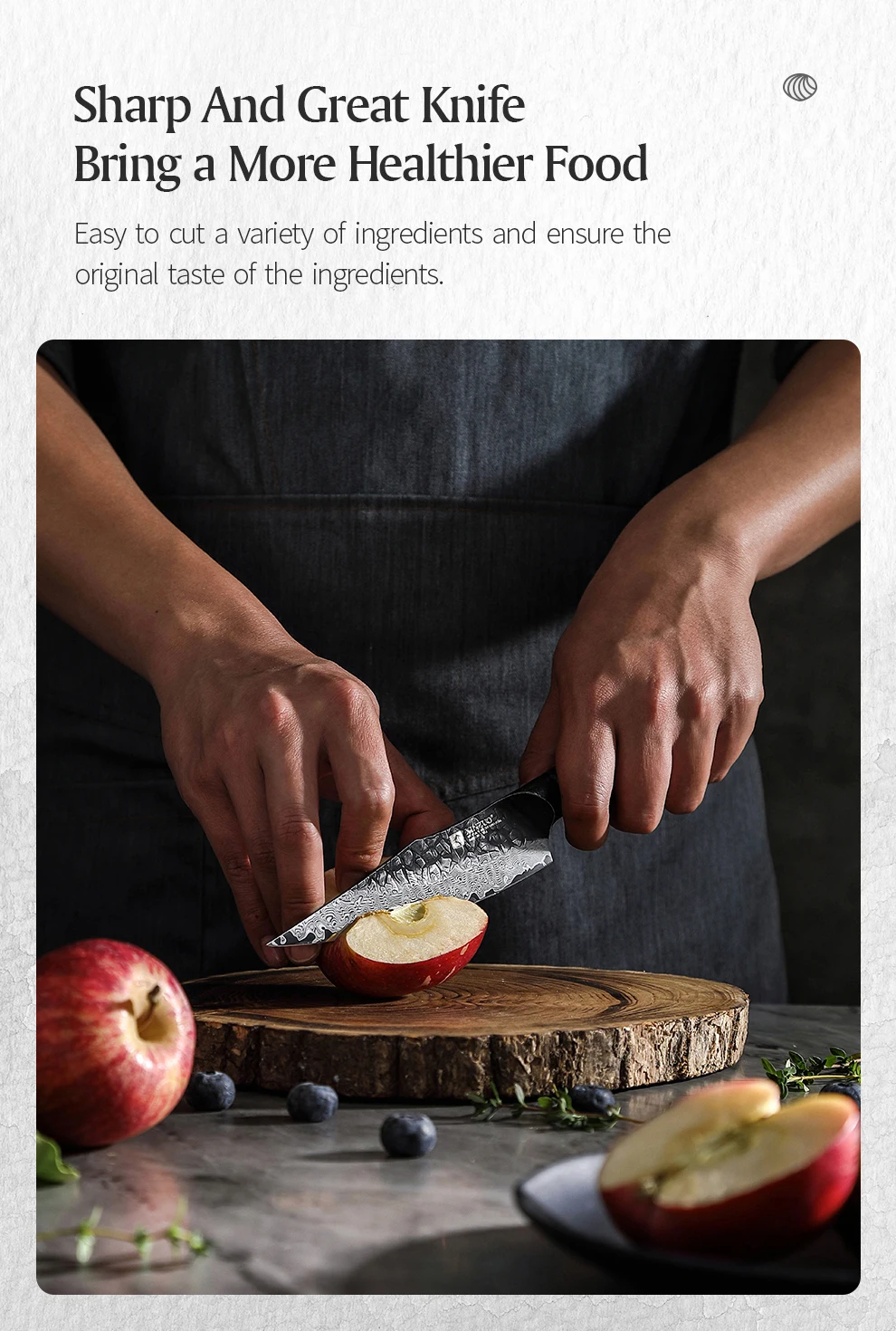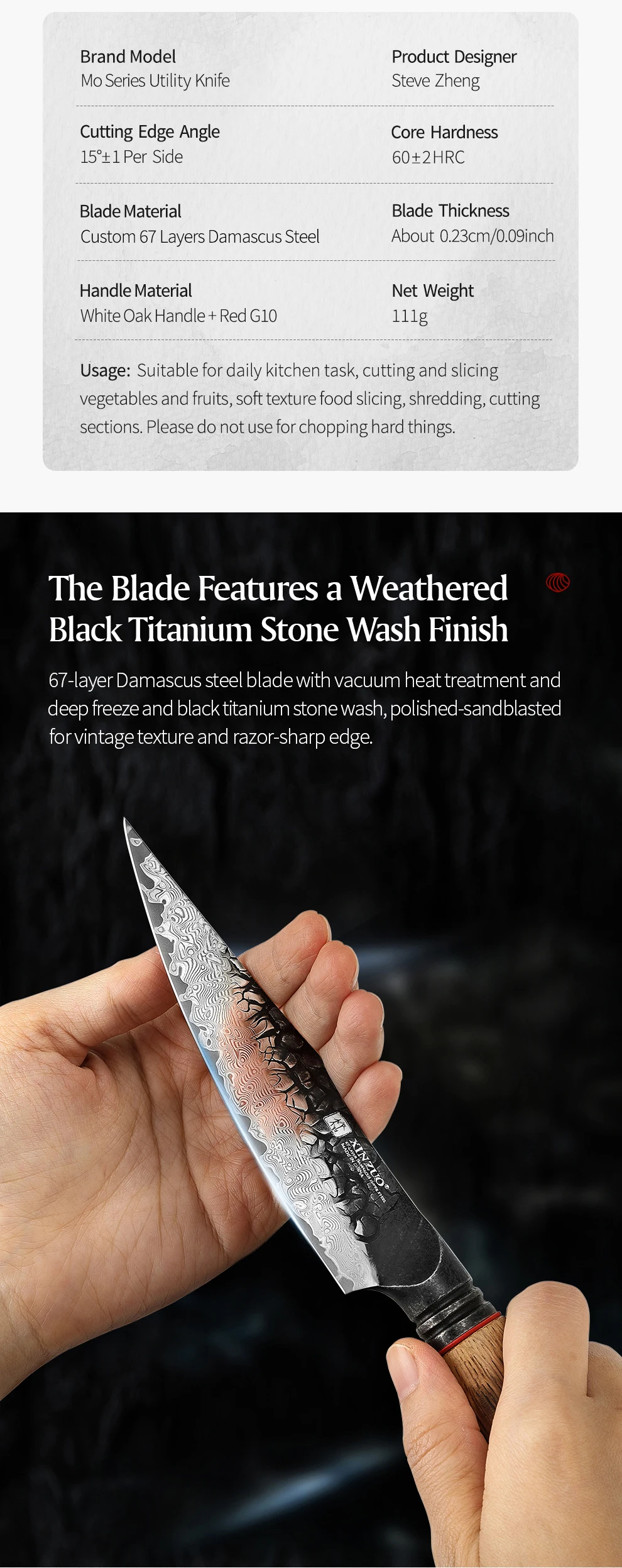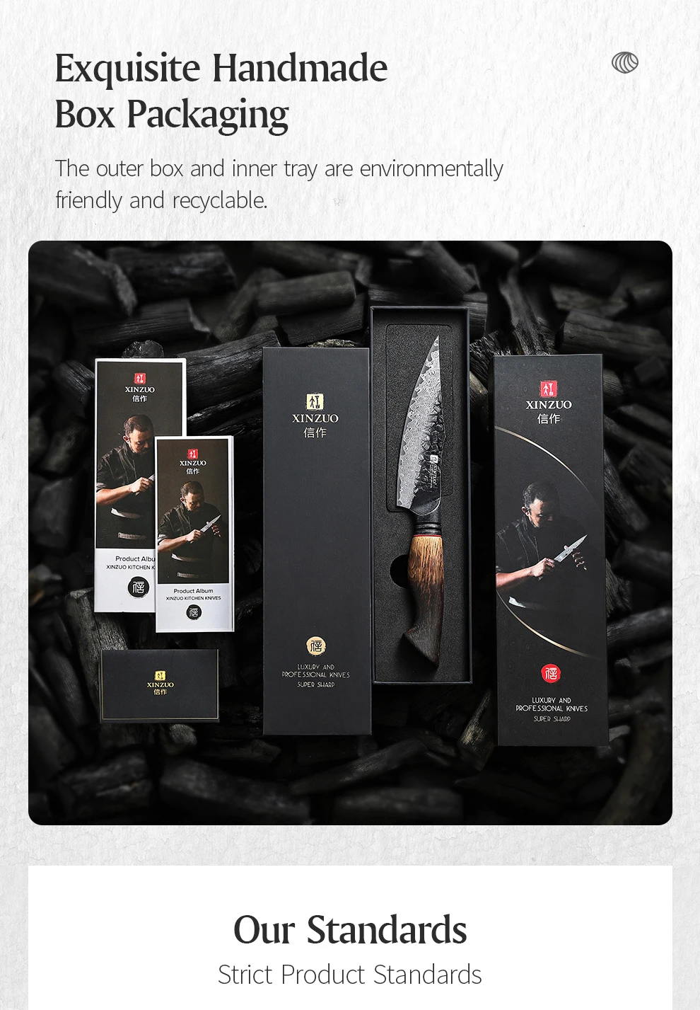XINZUO 5.5″ utility knife, 67 – Layer Damascus Masterpiece, forged with super steel, offers unrivaled sharpness and durability.